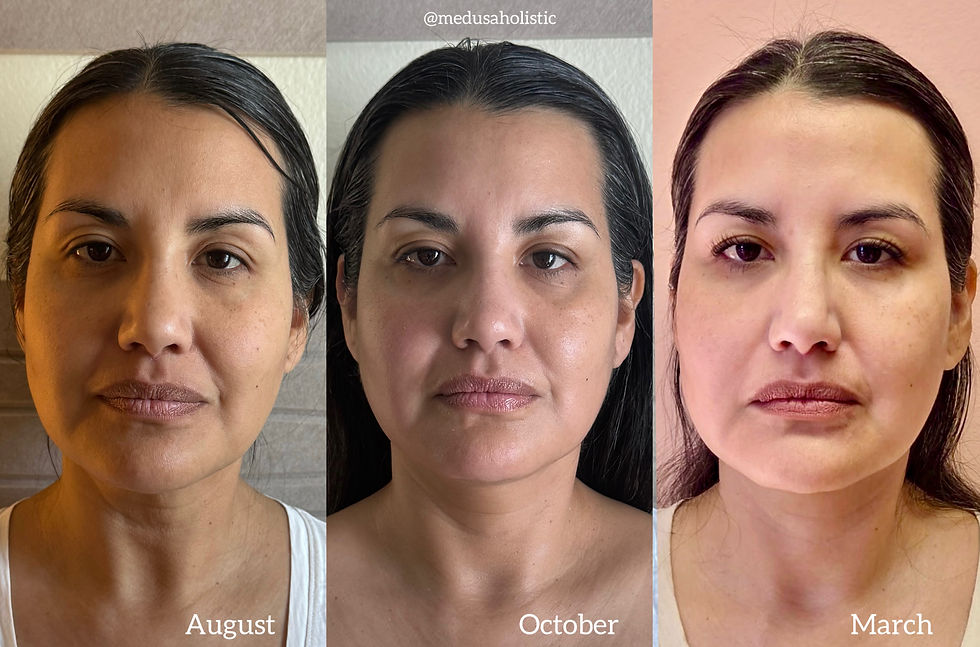 After her series of 8 was over, she continued to come in once a month for maintenance facials. We continued with the 90 minute myofascial release technique along with 30 minutes of facial reflexology. I incorporated red light during each treatment, focused on scalp massage, and chest and shoulder work. Each treatment was customized to her and what I felt she needed in that moment. Or what I felt needed more work and intention.